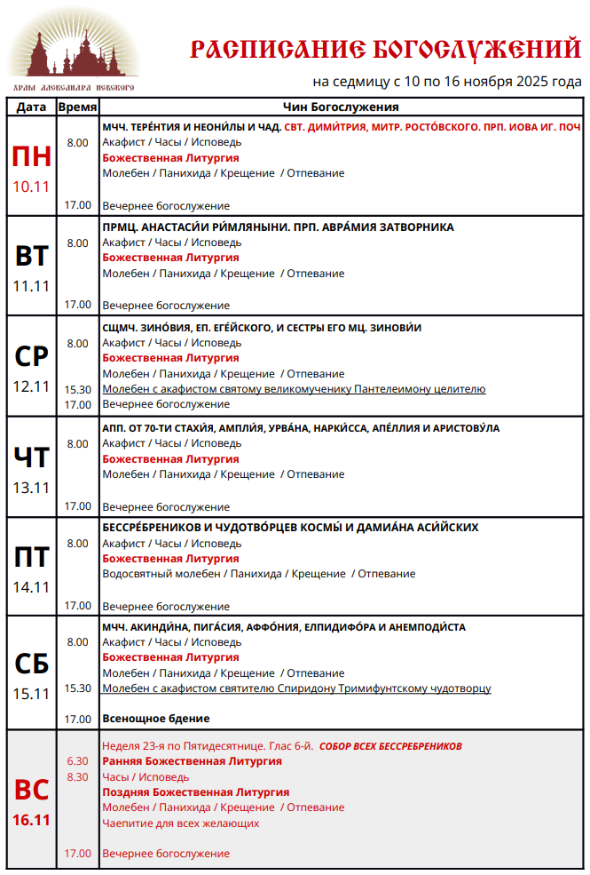 РАСПИСАНИЕ БОГОСЛУЖЕНИЙ