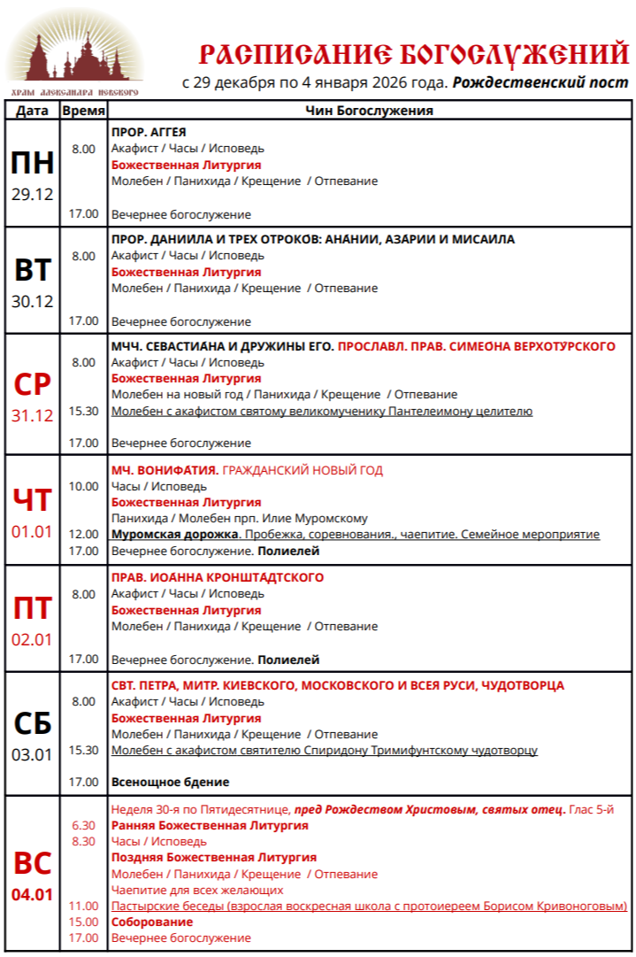 РАСПИСАНИЕ БОГОСЛУЖЕНИЙ